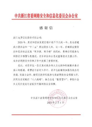 2月1日,因積極參與各項網(wǎng)絡(luò )安全技術(shù)支撐工作,遠望信息收到中共浙江省委網(wǎng)絡(luò )安全和信息化委員辦公室發(fā)來(lái)的感謝信,獲浙江省委網(wǎng)信辦點(diǎn)贊及認可。