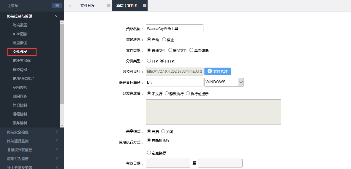 ? ? ? 通過(guò)文件分發(fā)下發(fā)免疫工具、專(zhuān)殺工具,并開(kāi)啟默認執行。