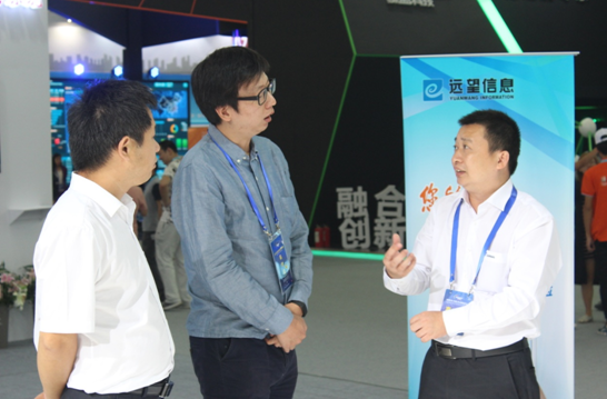 圖:新華社記者李維(中)在遠望信息展區采訪(fǎng)周征宇