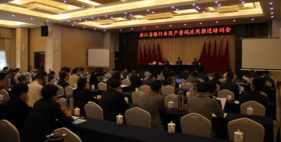 11月6日和7日,兩家主辦單位在杭州聯(lián)合舉辦浙江省銀行業(yè)國產(chǎn)密碼應用推進(jìn)工作培訓班。國家商用密碼管理辦公室主任趙丹應邀出席培訓班并作《金融領(lǐng)域國產(chǎn)密碼應用》專(zhuān)題講課,人民銀行杭州中心支行盧康權工程師作了《金融領(lǐng)域自主可控》業(yè)務(wù)培訓,培訓班邀請了工信部電子科學(xué)技術(shù)情報研究所作《政府部門(mén)網(wǎng)絡(luò )安全解決方案指引》的專(zhuān)題發(fā)言,并安排了杭州晟元芯片股份有限公司、浙江遠望電子有限公司、上海格爾科技有限公司等8家商用密碼從業(yè)單位交流介紹了金融領(lǐng)域國密載體安全技術(shù)應用和解決方案。