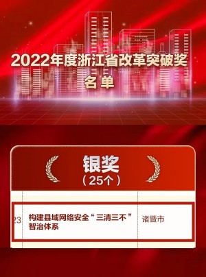 1月20日,中共浙江省委浙江全面深化改革委員會(huì )正式發(fā)布2022年浙江省改革突破獎名單,由遠望信息提供全體系數字化改革技術(shù)支撐的諸暨市“構建縣域網(wǎng)絡(luò )安全‘三清三不’智治體系”項目喜摘銀獎!